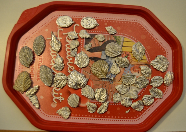 | Siskon pihalla olevasta pensaasta otettujen lehtiin tehdyt korvikset ja riipus. |